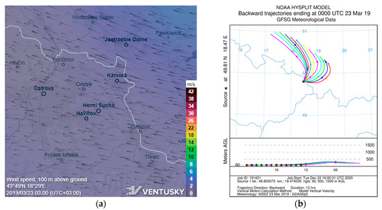 The modelled wind fields (a) and backward trajectories (b) for the smog situations in March 2019 [48,50,51].