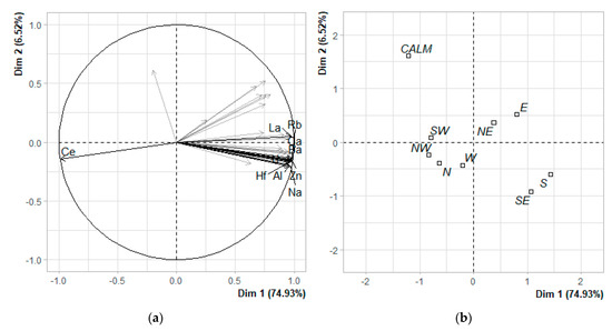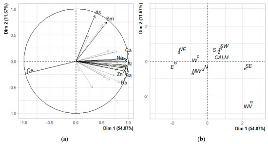 The elements most positively correlated with this dimension were Ba, Zn, Ca, Rb, La, Sm, Na, Hf and Al (Pearson correlation coefficient of 0.98, 0.98, 0.98, 0.98, 0.98, 0.98, 0.97, 0.97 and 0.96, respectively), while Ce was negatively correlated (Pearson correlation coefficient of −0.98). Thus, can be assumed that these elements describe this dimension well. Figure 8b shows that the sectors (from where the particulate matter was sampled) are divided alongside this axis mostly to the east and south group on its right and west and north group on its left. The calm has a high score on this axis, while having a high score also on the second axis.