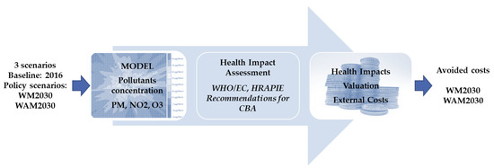 Scheme of the impact pathway approach for external cost calculations associated with the health impacts in the frame of cost–benefit analysis (CBA) of the policy scenarios (with measures: WM2030; and with additional measures: WAM2030). EC: European Commission; WHO: World Health Organization; HRAPIE: Health Risks of Air Pollution in Europe Project.