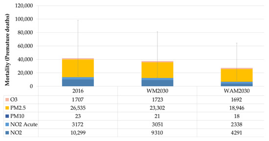 Regarding mortality, results show a remarkable decrease in premature deaths due to exposure to high levels of NO2, PM10, PM2.5, and O3 that goes from 41,713 premature deaths in 2016 to 37,386 premature deaths in 2030 for the WM2030 scenario (10% reduction), and 27,267 premature deaths in the WAM2030 scenario (35% reduction). Figure 2 shows the results of the mortality quantification due to the exposure to the different pollutants. The error bars show the uncertainty range related to the CRF relative risks (max and minimum RR).