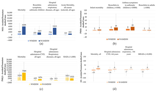 Avoided health impacts by pollutant: (a) NO2, (b) PM10, (c) PM2.5, and (d) O3. The results of the uncertainty analysis (from the CIs of the CRF and relative risk (RR) values) are shown as error bars.