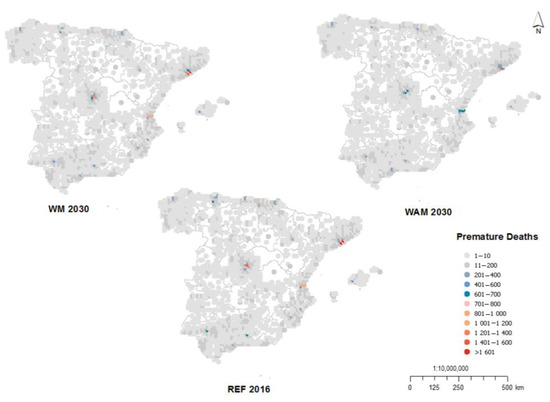 The CBA for the Clean Air Policy Package (CAPP) conducted by Holland [77] quantified deaths from PM2.5 and O3 exposure by time series from 2010 to 2030 (using reported emissions for 2010 and estimated emissions under the legislation at this moment for future years (year 2014). For Spain, they found a mortality attributable to PM2.5 of 23,963 and 21,668 premature deaths in the baseline scenarios for 2010 and 2030, respectively. In our study, results for the projected scenarios in 2030 are 23,302 premature deaths in the less ambitious scenario WM2030, and 18,946 expected premature deaths in WAM2030.