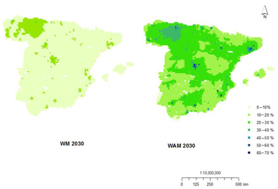 Figure 5 shows the spatial distribution of the ratio of avoided deaths to the premature deaths of the reference scenario. The decrease of premature deaths in the scenario WM2030 ranges from −1.5% to 22%, in comparison with the reference, with the largest reductions (>21%) in cities such as Madrid (in the middle of the country) and some points in the northwest (Galicia and Asturias). There are negligible increases in premature deaths in some locations along the Mediterranean coast (from 0.0181 premature deaths in 2016 to 0.0185 premature deaths in the scenario WM2030). This result is aligned with the air quality estimates. The coastal Mediterranean model grid cells present a large fraction over sea, with lower dry deposition (and thus higher concentrations), so these results must be carefully considered, due to the uncertainty in model resolution [25]. In most of the Spanish mainland, there would be some reductions on premature deaths with a vast area of the territory in the range from 0 to 10%. Under the WAM2030 scenario, the percentage of avoided deaths reaches more than 60%. The highest value (61% reduction), within the metropolitan area of the city of Madrid, indicates that 239 premature deaths would be avoided in an area where 389 premature deaths were attributable to pollution in 2016. Substantial reductions (>50%) are also predicted for urban areas around other cities, such as Barcelona, Seville, and Granada. Large reductions are also predicted for the northwestern area covering part of Galicia (ES11), Asturias (NUTS2 ES12), and Castille and Leon (ES41).