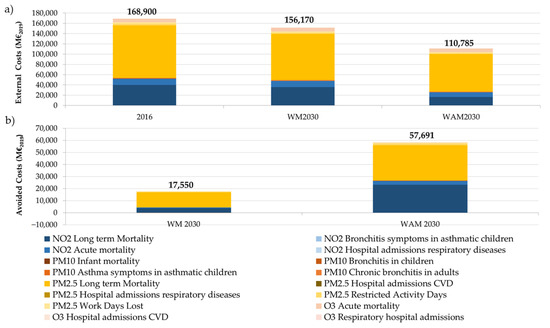 These impacts translate into medical costs and loss of wellbeing, known as external costs or externalities. Overall externalities are quantified for the extended set of concentration–response functions A* + B*. These costs amount to a total of 168,900 M €2019 in 2016, 156,170 M €2019 in 2030 under the scenario WM2030, and 110,785 M €2019 under the scenario WAM2030 (Figure 6a). The figure for 2016 is around 15% of annual gross domestic product (GDP), highlighting the severity of these impacts, and suggesting that Spain should take urgent action to reduce air pollution.