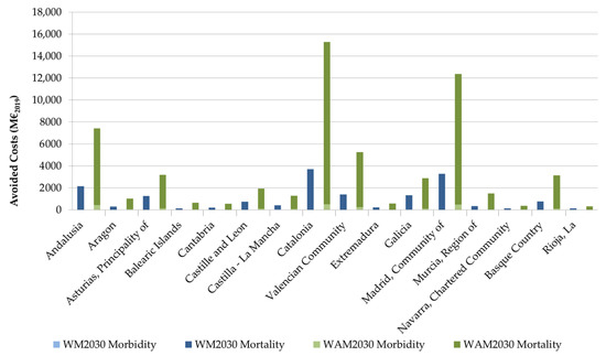 The analysis of these impacts, in terms of costs and benefits, has been done at NUTS2 level. Table 3 shows the contribution to the avoided costs due to the reduction of air-pollution-related mortality and morbidity per NUTS2 region. In Figure 7, these results are showed in absolute terms. The highest potential to reduce the external costs is estimated for Catalonia and Madrid, both above 3000 M €2019 in WM2030 scenario, and 15,000 and 12,000 M €2019, respectively, in WAM2030. In all cases, avoided costs are substantially higher in WAM2030 than in the WM2030 scenario. Additionally, in Andalusia, located in the south, there is a large decrease in estimated costs, due to the large area of this region (cumulative effect of a large number of small reductions), as well as the reduction of health impacts in some cities (Seville, Granada).