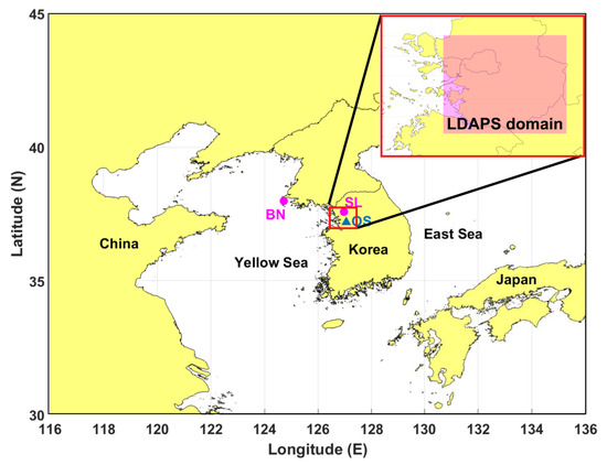 Location of two main sites (magenta circle) used in this study. Red rectangle indicates the analyzed domain (36.8–37.8 N, 126.4–127.8 E) of LDAPS. Blue triangle denotes Osan (OS) station launching rawinsonde four times a day. LDAPS indicates Local Data Assimilation and Prediction System.