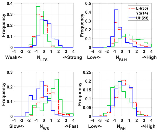 Histogram of , , , and for long-range transported haze (LH), yellow sand (YS), and urban haze (UH) cases at Seoul for 2011 to 2016. where x can be LTS (lower tropospheric stability), BLH (boundary layer height), and WS (wind speed) and RH (relative humidity) of 850 hPa. LTS is the difference between and .