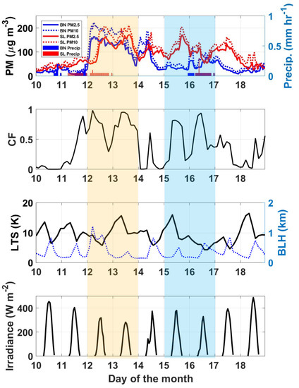 Temporal variations of total cloud fraction (CF), LTS (), BLH, and solar irradiance during the entire measurement period are shown in Figure 3. Time series of domain-averaged CF shows a significant increase up to 0.98 on 12 January when PM10 and PM2.5 began to increase at both BN and SL. It might be interpreted that clouds could be maintained longer through the modification of cloud microphysics due to the enhanced aerosols. Consistent with Figure 3, LTS decreased and BLH increased during the transported period of 12 January such that higher mixing height with less stability could help to transport aerosols to the analysis domain. Cloud fraction on 13 January was still higher (~0.9) even after precipitation ended. Increased cloud fractions reduced solar irradiance (~280 W m−2) on the surface because of the enhanced scattering of incoming solar radiation by persistent clouds. Accordingly, it is thought to decrease BLH to 163 m from 794 m and increase LTS to 15.7 K from 5.7 K (the previous day). It might imply that the modified meteorological condition induced by transported aerosols leads to maintain elevated aerosol concentration much longer on 13 January around Seoul after long-range transport of aerosols on 12 January.