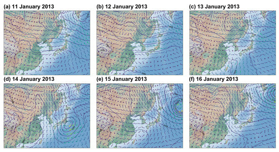 Figure 4 indicates synoptic weather charts at 850 hPa level generated by the ECMWF at 0600 UTC during 11–16 January 2013. On 11 January 2013, a trough system centered at the Manchuria passed by the northern Korean peninsula, which brought light precipitation (less than 0.1 mm h−1) in Korea on 12 January (Figure 3), especially around the mid-Korean peninsula region. Eun et al. [4] suggest the precipitation lasted even after PM concentration began to increase around noon, which implies aerosol scavenging effect suppressed during the precipitation since probably enhanced aerosol loadings could have an impact on cloud and precipitation. The kind of stagnant synoptic systems lasted until the next day, 13 January, with the rain stopped. Isolines of geopotential height around Korea were zonally parallel from west to east in the 850 hPa weather chart (Figure 4), which would accelerate the aerosols transport to Korea from East China. The enhanced aerosols pollution had been steadily maintained for about 2 days by the persistent synoptic environment during the first period. Gradually, the synoptic pattern has changed along with the northerly flow by low pressure developing in the southern Sikoku, Japan on 14 January (a transition day).