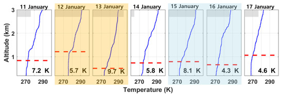 Vertical profiles of potential temperature (unit: K) from rawinsonde at 0600 UTC during 11 to 17 January at Osan, with the corresponding BLH (red dashed line) as computed using the Heffter’s method. The numbers in the lower part and gray shading in the upper part indicate LTS from rawinsonde and total cloud fraction based on LDAPS at 0600 UTC, respectively. Orange and blue shadings indicate the first and second periods, respectively.