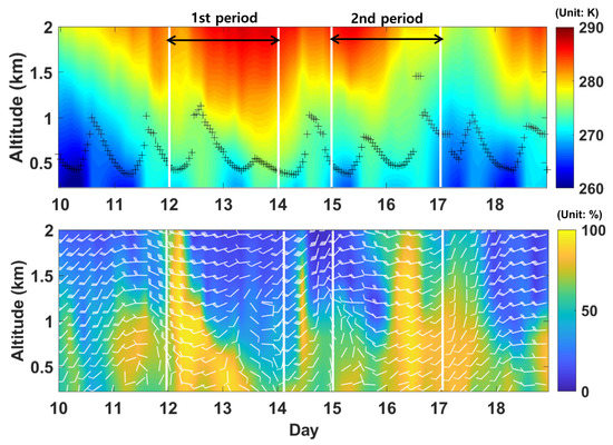 Time series of vertical distribution of domain-averaged potential temperature (upper panel) and relative humidity (bottom panel) using LDAPS. Cross markers in upper panel indicate the boundary layer height based on the Heffter’s method. Wind flags in the lower panel represent horizontal wind direction and wind speed (unit: m/s).
