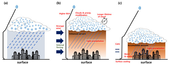 Schematic diagram of aerosol-meteorological interactions in Korea. (a) normal condition, (b) clouds and precipitation response to aerosol external forcing representing the first period (12–13 January), and (c) enhanced haze due to the meteorological condition modified by aerosol-cloud-precipitation interactions indicating the second period (15–16 January).