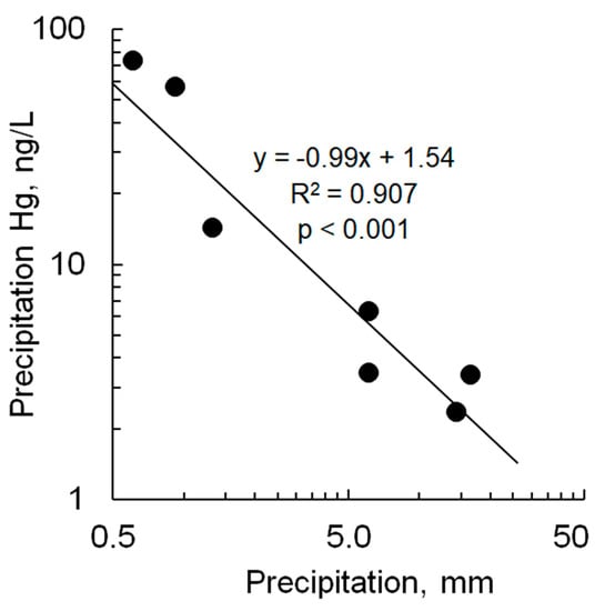 Except for the June and July events in Pullman, which had elevated THg concentrations in precipitation of 73 ng/L and 57 ng/L, respectively, the results of this study were comparable to concentrations reported worldwide, which typically range from 1 to 15 ng/L []. Concentrations are also similar to those measured in California precipitation, which ranged from 1 to 28 ng/L and averaged 4 ng/L (n = 46) []. The extreme concentrations measured in Pullman appear to be relatively uncommon at other reported monitoring sites. In hundreds of precipitation samples from Europe and China, 95th percentile THg concentrations rarely exceeded 40 ng/L []. The high Pullman THg concentrations were undoubtedly related to the small precipitation amount associate with these monitored events. While annual Hg deposition generally correlates with total annual precipitation, THg concentration in collected precipitation generally shows a negative correlation with precipitation amount []. This observation is attributed to scavenging of Hg from the air column early during storm events and subsequent dilution of the accumulating sample later in the event. The relationship between THg concentration and precipitation amount was apparent in our pooled samples (Figure 4). This phenomenon, combined with the fact that agricultural activities can enhance Hg re-emission from the landscape [,], explains the high Hg concentrations in precipitation observed during small rain events in Pullman in June and July.