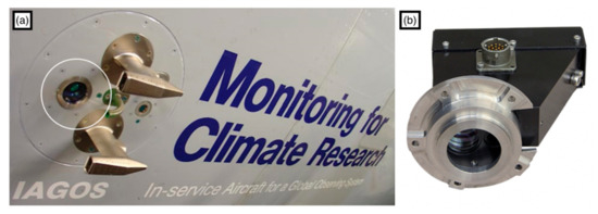 (a) Instrument installation on the In-Service Aircraft for a Global Observing System (IAGOS) instrumented Airbus and (b) the backscatter cloud probe (BCP).