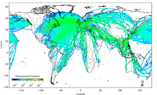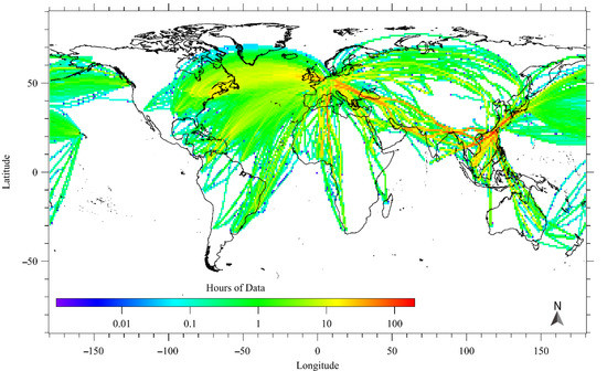 Figure 2 shows the global distribution of BCP measurements (one degree resolution) at high altitude (≥10 km) over 79 months between December 2012 and July 2018. This shows that the measurements are extensive across the globe from 43° S to 77° N, with the greatest frequency of measurements focused on commercial air routes over Europe, Africa, across the Atlantic to North and South America, with another focus of activity on South East Asia. The total hours of flight are shown in Figure 3 with favoured routes having 10 s or even 100 s of hours of measurement points. In total, this measurement approach has provided over 60,000 h of measurement data.