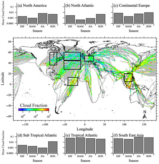 Here, we present 6 regions and calculate the cloud fraction by season. These regions are described and highlighted in Figure 4. The seasons are split into December, January, February (DJF), March, April May (MAM), June, July August (JJA) and September, October, November (SON). The global map shows the one degree binned annual cloud fraction value, the grey colours represent areas in which measurements were made but no cloud was observed. The black boxes enclose the domains that were selected for further analysis by season. The bar charts surrounding the global map represent cloud fraction split by season for each region.
