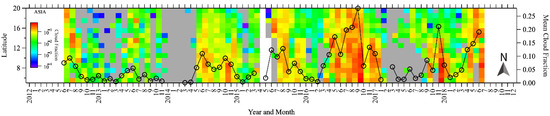 The South East Asia region exhibited a significant increase in cirrus cloud fraction during 2016 centred around the JJA and SON period (Figure 5). Although our measurement period is limited in the context of the ENSO signal, this is consistent with the findings reported by Virts and Wallace that found a shift in peak cloudiness towards the maritime continent during La Nina [31].