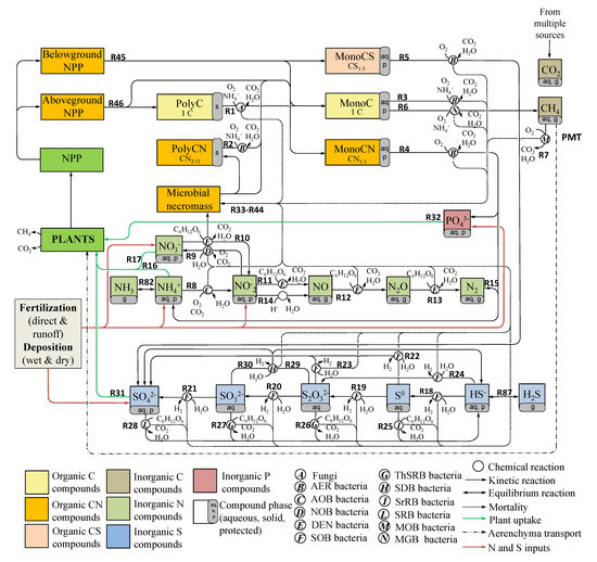 The Biotic and Abiotic Model for SOM-version 4 (BAMS4, Figure 1) is a simplification of the carbon-nitrogen-sulfur cycle model (BAMS3) designed in [25], and based on [26,27,28]. The C cycle includes the depolymerization of two organic polymer pools (PolyC, PolyCN), aerobic respiration of three organic monomers (MonoC, MonoCN, and MonoCS, representing the organic C, N, and S), CH genesis, and aerobic oxidation. The C cycle was linked to the inorganic N, S, and P cycles to account for nitrification (NH→ NO; NO→ NO ), denitrification (NO→ NO→ NO → NO → N), chemo-denitrification (NO→ NO + NO), N fixation (N→ NH), S species reduction (SO→ SO→ SO→ S→ HS), oxidation (HS→ S→ SO→ SO→ SO), disproportionation (SO→ SO + HS; SO→ SO + HS), P mineralisation (MonoCN → PO), and C, N, and S protection on the soil matrix (e.g., mineral surface binding).