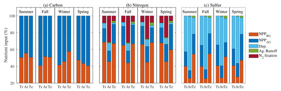 (a) Carbon, (b) nitrogen, and (c) sulfur fractional input contribution in soil in each climatic class and for each season. Tr, Ar, and Te represent tropical, arid, and temperate regions, respectively. NPP, NPP, Dep., and Ag. Runoff refer to soil organic matter (SOM) input below and above ground, total deposition, and agricultural runoff, respectively.