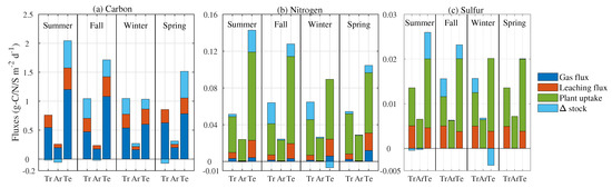 The N input to the soil is almost one order of magnitude less than C in each season (Figure 3b), and most of the N in the soil is removed by plant uptake (green bar Figure 3b). The stock is always positive, resulting in N accumulation, except during winter in the temperate region. The total N input reaches a minimum in this season, on average 0.1 g-N m d, but gas emission, leaching, and plant uptake rates remain almost constant, degrading the soil N gained in the previous seasons.