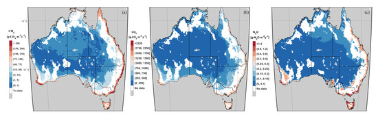 NO emission hot-spots can be found in high fertilization areas such as the wheatbelt (blue and yellow grid cells in Figure S2a), and where high N deposition occurs such as in TAS and NT (Figure S3a). In contrast, no or limited CH emissions occur in the central part of Australia due to very small wetland fractional area and very low NPP in arid conditions, allowing only short grass or bush to grow [50]. However, this area has very high CO emissions (Table 2) because the topsoil is mostly unsaturated during the year, thus allowing aerobic degradation at a rate approximately ten times faster than anaerobic degradation. Tropical and temperate regions have less wetland area than the arid regions, but CH emissions are three and six times higher, respectively. Moreover, with approximately the same wetland area, the temperate region has three times greater NO emission than the tropics due to agricultural fertilization.