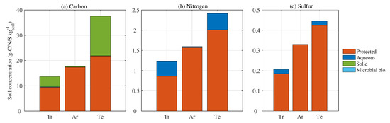 (a) Carbon, (b) nitrogen, (c) sulfur pool size in soil divided into protected, aqueous, solid, and assimilated in the microbial biomass (Microbial bio.). Tr, Ar, and Te represent tropical, arid, and temperate regions, respectively.