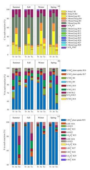 Cumulative carbon (a) nitrogen, (b), and sulfur (c) normalized mass fluxes through the reaction network: R1, depolymerization of organic carbon polymer; R2, depolymerization of organic carbon-nitrogen polymer; R3, aerobic respiration of organic carbon monomer; R4, aerobic respiration of organic carbon-nitrogen monomer; R5, aerobic respiration of organic carbon-sulfur monomer; R6, anaerobic respiration of organic carbon monomer; R7, aerobic CH oxidation; R10, NO denitrification; R11, NO denitrification, R12, NO denitrification; R13, NO denitrification; R25, S reduction; R26 SO reduction; R27, SO reduction; R28, SO reduction; PMT, the plant mediated transport; R16, NH plant uptake; R17, NO plant uptake; R8, NH nitrification; R9, NO nitrification; R14 chemo-denitrification; R31, SO plant uptake; R18, HS oxidation; R19, S oxidation; R20, SO oxidation; R21, SO oxidation; R22, S oxidation; R23, SO oxidation; and R24, HS oxidation. Refer to Figure S1 and Tables S1–S6 in the Supplementary Information for each reaction code RX and kinetic equation. Tr, Ar, and Te represent tropical, arid, and temperate regions, respectively.