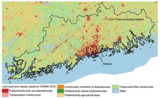Overview of simplified CORINE 2018 land use/cover categories in the study areas: HUS is indicated by the outer black border; Helsinki by the inner black border; HUS-H area (HUS excluding Helsinki) by the area between the outer and inner borders. Land use/cover categories are indicated in the legend: red, orange or purple colours indicate predominantly urbanised areas, whereas yellow, green and blue colours indicate predominantly rural or natural areas.