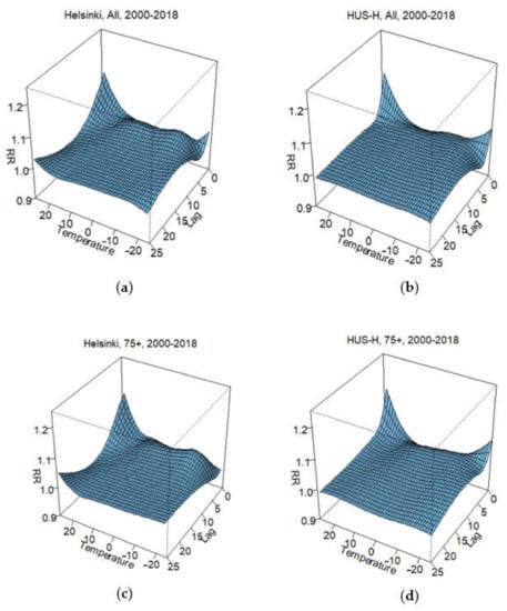 Relative risk (RR) of all-cause mortality as a function of daily mean temperature and lag (days) in the city of Helsinki (a,c) and Helsinki-Uusimaa hospital district without Helsinki (HUS-H, (b,d) in 2000–2018. In the upper panels (a,b), all ages and in the lower panels (c,d) 75+ relationships. The RR is with respect to the mortality at +15 °C.