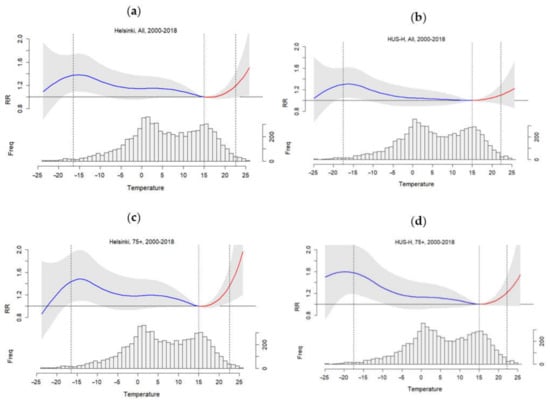 Table 1 shows RR at temperatures relevant for issuing heat and cold warnings in southern Finland. The heat-related RR among the elderly was almost double compared to the all-age risks at the same temperatures; e.g., in Helsinki the all-age RR was 1.06 when the RR of the elderly was 1.12 at the temperature of +20 °C. The cold-related RR of the elderly were also substantially higher than the all-age RR; e.g., in Helsinki, all-age RR was 1.38, while the RR of the elderly was 1.47 at −15 °C. However, at very cold extremes in Helsinki, the all-age mortality risk appeared higher than the risk of the elderly. When compared regionally, both all-age and elderly heat-related risks were higher in Helsinki than in the surrounding HUS-H; e.g., at +24 °C, the all-age RR was 1.30 in Helsinki and 1.16 in HUS-H. Cold-related risks were higher in HUS-H among the elderly, while the all-age risk appeared higher in Helsinki. However, as indicated by the 95% confidence intervals, uncertainties were substantial around the risk estimates at the highest and lowest considered temperatures.