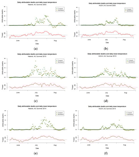 Based on the modelled temperature–mortality relationships, we assessed attributable deaths to selected heatwaves using methods developed by Gasparrini and Leone []. The four major heatwaves, with substantial and previously demonstrated increases in mortality, took place in Finland in the summers of 2003, 2010, 2014 and 2018 [,]. In this study we compared the mortalities in Helsinki and the surrounding HUS-H area during these heatwaves.