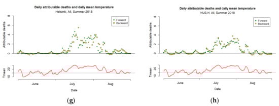 Daily deaths attributable to heat in summers 2003, 2010, 2014 and 2018 and daily mean temperature in Helsinki (a,c,e,g) and Helsinki-Uusimaa hospital district without Helsinki HUS-H, (b,d,f,h). These estimates were based on the modelled temperature–mortality relationships during 2000–2018, in which the impact of heat on mortality risk lasted for a few days. “Forward” refers to the prediction of the number of deaths based on the temperatures, and “backward” to the perspective in which the number of deaths was explained by the temperatures of the previous few days.