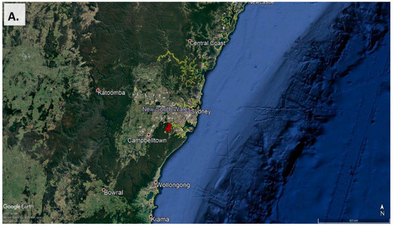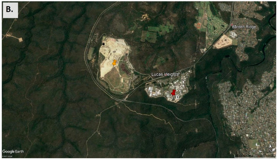 (A) Map of the sampling site location within its regional context in the southeast of Australia, showing ~100 km around the sampling point [48]. (B) Close-up view of the sampling site (red indicator) and its surroundings [49]. The yellow indicator shows the location of the Lucas Heights waste management facilities. Forest surrounds most of the area. There are residential areas close by to the east and further away to the west.