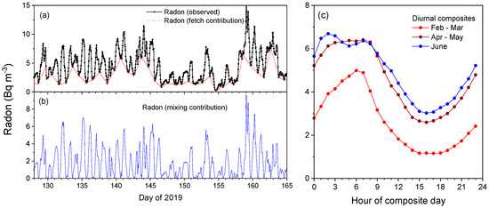(a) A 5-week example of observed radon concentrations and the corresponding fetch-related contribution. (b) Mixing-related contribution to observed radon (observed—fetch), the x axis shows decimal days of 2019. (c) Diurnal composite radon concentrations for the hot (February–March), warm (April–May) and cold (June) months of the study.