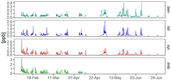 Timeseries of AVOCs measured at the ANSTO site using the BAASS. Ben = benzene, xyl = p-xylene, tol = toluene and tmb = 1-2-4-trimethyl-benzene. TMB concentrations were not recorded after mid-April due to an error in the GC-MS analysis method (see Supplementary Materials).