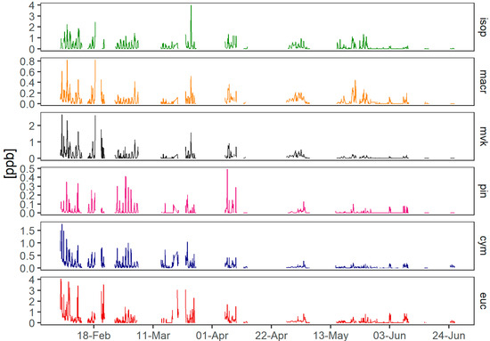 The BVOCs observed during the COALA-JOEYS campaign exhibit large variability in their ambient concentrations due to their short atmospheric lifetimes and the dependence of the emissions on temperature and sunlight [16]. Peak values of approximately 8 ppb were observed at midday in February, falling to near zero overnight. BVOCs constitute the major fraction of total atmospheric VOCs in summertime and early autumn while AVOCs dominate during the early winter.