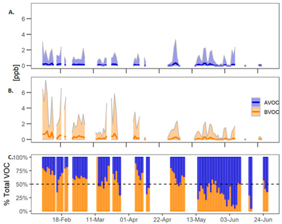 Total AVOC and BVOC during COALA-JOEYS. (A) Sum of the concentration of benzene, toluene and p-xylene; (B) Sum of isoprene, MVK, MACR, eucalyptol, p-cymene and α-pinene. The dark line shows the mean value and the area around the line shows the daily minimum and maximum values. (C) Ratio of biogenic and anthropogenic VOCs to the total VOC load excluding TMB.