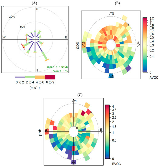 During the sampling period, winds coming from the SE and SW were the most frequent (Figure 6A). W-N-NE winds have the higher influence on AVOC concentrations (Figure 6B), with the highest concentrations observed when winds are light from the NW, most likely bringing polluted air from the broader Sydney metropolitan area ~31 km away and the Lucas Heights waste management facility to the west (Figure 1).