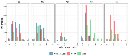 Wind speed frequency distribution per month during the COALA-JOEYS. Only the wind speed data of the sampling period were included.
