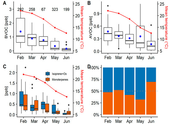 (A) Box plot showing the variation of the total daily mean targeted BVOC concentration per month, along with the monthly mean temperature (24 h) in red. The black line represents the median, the line on the box is the 95% of the distribution range and outliers are shown as black dots. The number on top of the box plots represents the number of samples per month in the analysis. The blue dot represents the overall mean concentration. (B) Box plot showing the total daily mean concentration of targeted AVOCs per month along with the monthly mean temperature in red. Most of the variability observed in May can be explained by periods of high advections and wind speed onsite. (C) Daily mean concentration box plot of the monoterpenes (orange) and the sum of isoprene and its oxidation products (blue). (D) Relative contribution of BVOC groups (Isop+ox; monoterpenes) estimated from the average concentration of each group divided by the sum of both groups per month.