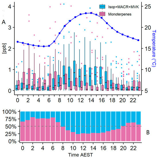(A) Composite mean concentration of monoterpenes and isoprene grouped by hour between February and May. On the right y-axis is the average temperature for the analysed period. June data were excluded to capture a better representation of the influence of temperature on VOC concentrations. The black line represents the median, the line on the box is the 95% of the distribution range and outliers are shown as blue and pink. The calculated PAR from the solar radiation observations has a correlation coefficient with temperature of 0.62, and both parameters follow a similar daily pattern influencing the VOC emissions (see Supplementary Figure S8). (B) Percentage contribution of BVOC groups to total BVOC loading per hour using mean concentrations.