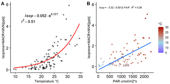 A multivariate linear regression model was applied to the total isoprene, MACR and MVK measurements, with temperature and PAR as the independent variables. Slopes from the multivariate model showed a greater influence of temperature on isoprene concentrations (slope of 0.14 compared to 0.0002 from PAR) and a r2 = 0.51. To evaluate the independent influence per variable, a nonlinear model was applied to the daylight data of the isoprene group to evaluate the temperature and PAR dependence (Figure 10). When plotting against temperature, an exponential fit is observed (Figure 10A; r2 = 0.51). This result has as large a correlation as the combined temperature and PAR linear model described above, indicating the dominant role of temperature in daylight isoprene levels. The dominant role of temperature has been observed in previous studies measuring emissions from plants and in ambient measurements [20,61,63,64,65]. The COALA-JOEYS measurements were made in ambient air and not directly from the source; therefore, the effects of other variables influencing isoprene concentration, such as the atmospheric mixing and advection as well as the chemistry happening during transport, are not included in the model. There was no clear relation between PAR and the ambient concentration of isoprene and its oxidation products when using all the daylight data due to very high scatter in the data (see Supplementary Figure S9). There was an especially high variability of isoprene and its oxidation products observed during days with temperatures over 30 °C and winds coming from the north. These two conditions favoured the emission and transport of isoprene, MACR and MVK from the north and northwest even during periods where no PAR was incident. These isoprene peaks were especially common during the late afternoons where temperature was over 28 °C. Data with temperatures over 20 °C during hours with PAR less than 500 µmol m−2s−1 were filtered out and then a second filter applied, removing category 1 and periods of nocturnal synoptic non-stationarity (radon stability categories) both characterised by high wind speed and advection. A linear model was applied to the filtered data (Figure 10B). At the COALA-JOEYS site, a combined influence of meteorological and chemistry factors may be masking the influence of PAR on isoprene emissions. A direct measurement of emissions could clarify this influence but that is out of the scope of the present study.