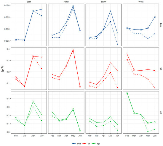 Comparing the February to April period to the May to June period, the concentration of benzene increased slightly, toluene remained stable, but p-xylene concentration was reduced as the year progressed (see Table 6). Dividing the data by wind direction shows that northern, eastern and southern winds show similar trends where benzene, toluene and xylene concentrations increase until May (as atmospheric mixing decreases) and then decrease by up to a factor of 4 in June (see Figure 11). In contrast, the winds coming from the west show a different pattern, with toluene and xylene decreasing as the year progresses into winter and benzene staying relatively stable and then increasing in June.