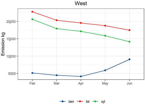 Monthly emissions from the NSW emission inventory from the suburbs located west of the sampling site. Ben: benzene, tol: toluene and xyl: xylene.