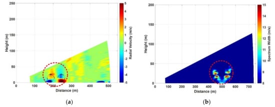 The wake vortex makes the radial velocity distribution of PCDL RHI scans different to the ambient wind field with the crossover structure of positive and negative values; thus, it is possible to separate the wake vortex from the environment wind field, as shown in Figure 4a. Apart from the anomaly of radial velocities, wake vortex tangential velocities also cause the spectrum to broaden. In a single sampling volume, the FFT spectrum data in the wake vortex region usually have three Doppler velocities––the main spectral velocity, the minimum velocity, and the maximum velocity [14,32]––when a certain threshold is given. The minimum or maximum velocity related to vortex tangential velocity can be used as an indicator for the presence or absence of the wake vortex in PCDL RHI scans. The Doppler shift difference between the minimum and maximum velocities is called the spectrum width in this paper. Figure 4b shows the spectrum width distribution in RHI scans when an A333 aircraft landed at CSIA at 13:29 on 26 August 2018. The wake vortex induced significant spectral broadening at 500 m away from PCDL, as shown in Figure 4b.