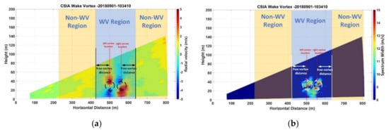 Wake vortex region and non-wake vortex region in (a) radial velocity distribution, and (b) spectrum width distribution of PCDL RHI.