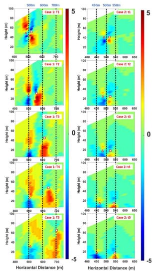 First, the horizontal positions of the left and right vortex cores both moved away from the PCDL, influenced by the superposition of stronger crosswind and the self-induced lateral propagation velocity. The centerline of the left and right vortex cores drifted from 500 m at T1 to approximately 615 m at T5. Meanwhile, the left vortex (upwind vortex) core moved from 480 m to 510 m during T1~T5, accompanied by the right vortex (downwind vortex) core from 520 m to 700 m with the faster movement speed. As the wake vortex evolved, the distance increased between the left and right vortex cores, as is depicted in Figure 8, Case 1. Second, the wake vortex descended significantly from 50 m at T1 to approximately 30 m at T2. However, the falling process began to change due to the near ground effect from T3 to T5, during which both the left and right vortices rebounded. These observation results are compatible with the corresponding simulations in [26]. The rebound time of the left vortex (upwind vortex) started from T4 later than that of the right vortex (downwind vortex), which is consistent with the conclusion of the numerical simulation [25]. Additionally, the right (downwind) vortex was higher than the left (upwind) vortex after the rebound process, although the two heights were the same in the initial stage. These differences between the downwind and upwind vortices strongly depend on the crosswind strength, as explained in [26].