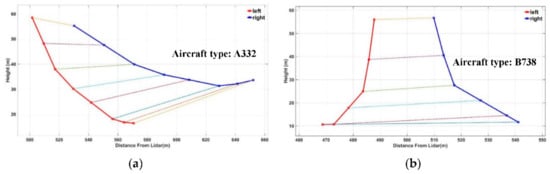 The PCDL conducted the range height indicator (RHI) to detect the aircraft wake vortex and obtain the crosswind field during the WVOE. The RHI scanning mode was designed to describe the fine structure of small scale wake vortex with the elevation angle resolution between 0.1° and 0.4°, corresponding to the transverse resolution at range of probing volume (the unit of is radian in this formula). For instance, if range is 150 m, the transverse resolution will be approximately 0.3 m~1.0 m. The duration of one RHI scan takes 10 s to 20 s, with a lidar beam scanning speed of 1°/s~2°/s. Considering the lidar experimental location, the scanning velocity, and the transverse resolution, the elevation angles of RHI scanning mode were set to 0°~25° for the take-off phase at MNA, 0°~10° for the landing phase at CSIA, and 5°~25°for the take-off phase at CSIA, as shown in Table 3. The PCDL scanned alternately up and down using the RHI scanning mode on the plane perpendicular to the runway. Table 3 shows the detailed information of the experimental configuration.
