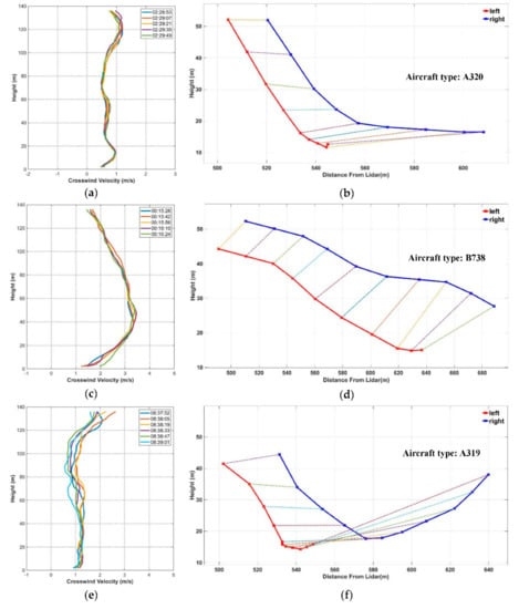 Wake vortex trajectories under various crosswind conditions. (a) The crosswind profiles and (b) wake vortex trajectories during 02:28:53~02:29:49 on 27 August 2018; (c) the crosswind profiles and (d) wake vortex trajectories during 00:15:28~00:16:24 on 27 August 2018; (e) the crosswind profiles and (f) wake vortex trajectories during 08:37:52~08:39:01 on 1 September 2018.