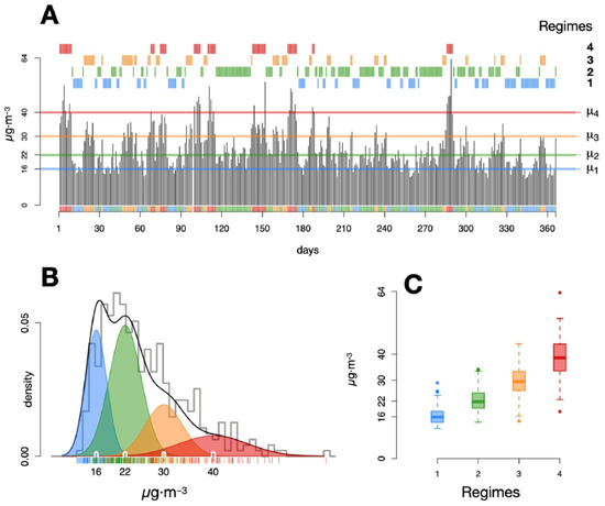 For many practical applications, there is often some physical significance attached to the hidden states of the HMM. For instance, in economics, states of the HMM can be related to expansion and recession periods and the interest is in studying the dynamics between them [25]; in developmental psychology, the states of the HMM are used to quantify knowledge that subjects express in an implicit learning task [26]. In this work, clusters of TS data are assigned to represented different PM concentration ranges (regimes of concentration or pollution profiles) in each modelled annual TS. HMM provides, inter alia, the mean and standard deviation values for each regime. These values represent the different parameterisation of the Gaussian distributions assigned to the regimes, providing very useful information as they fully characterise every analysed TS for a given time period and monitoring site. Each cluster’s average values were represented as µi (i = 1,…, n) with n the number of detected clusters in the TS data (Figure 1A).